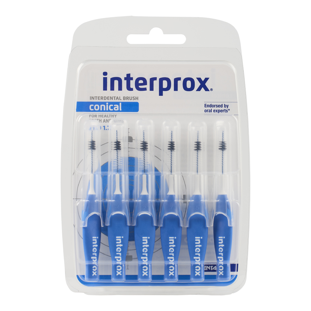 O Interprox® Conical foi especialmente concebido para eliminar o biofilme oral (placa dentária) acumulado nos espaços interdentais. O tamanho da sua cabeça cónica adapta-se aos espaços interdentais médios.